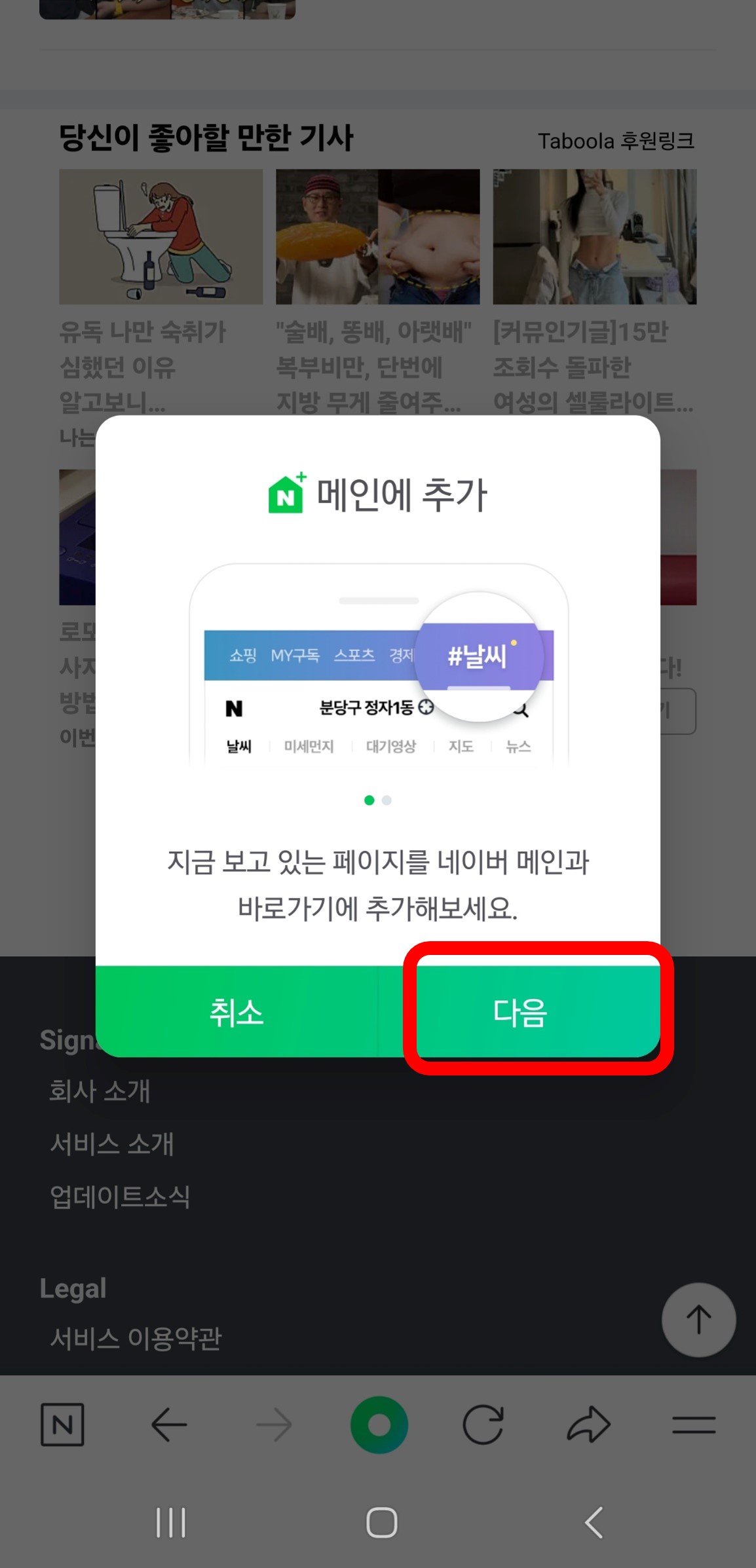 하단에 "네이버 메인에 #Signal 추가"를 클릭합니다.