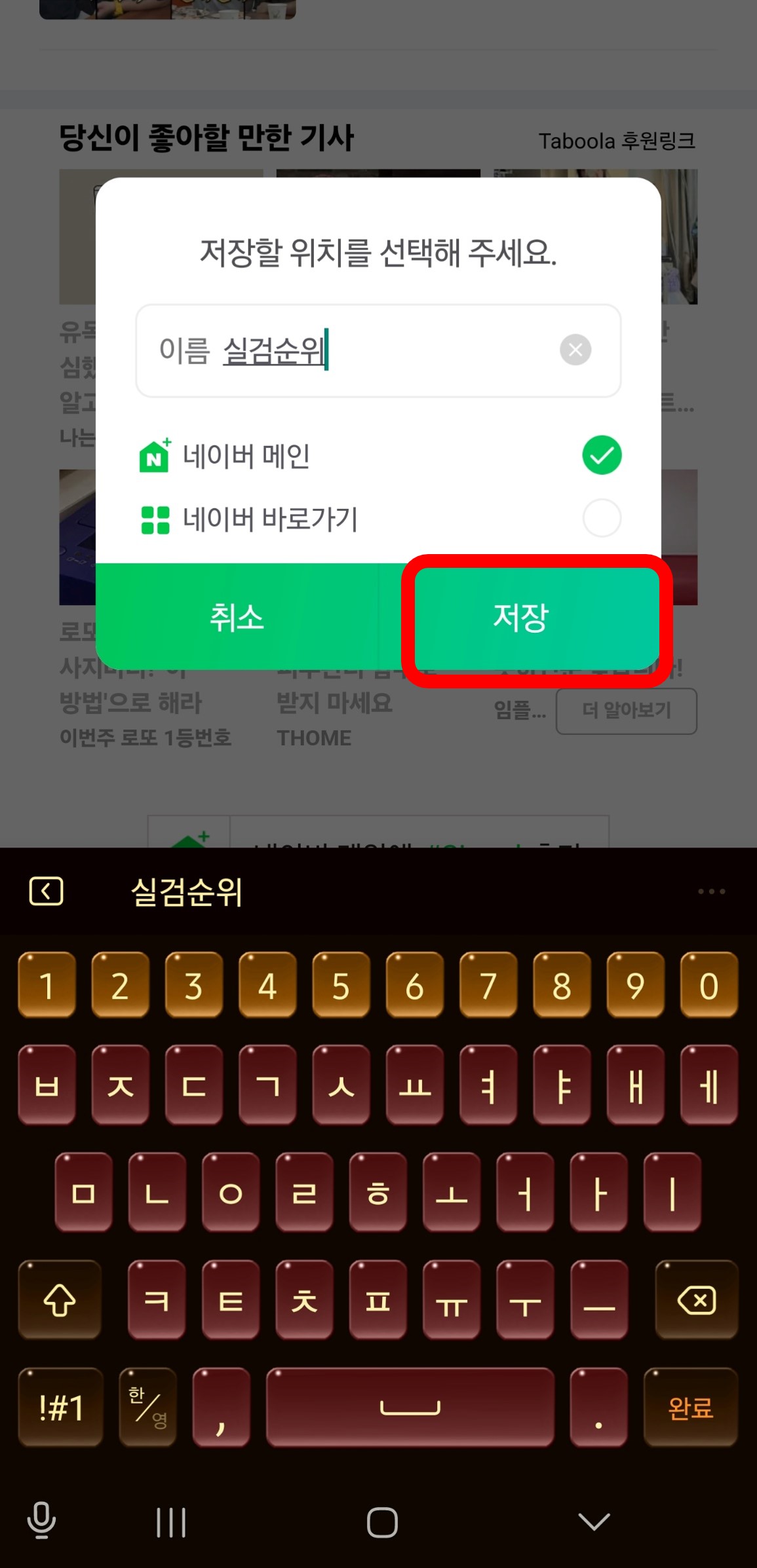 2. 네이버 메인 항목에 넣을 제목을 설정합니다. 저는 "실검순위"로 저장했습니다.