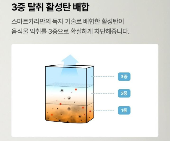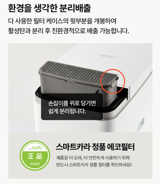 스마트 카라는 숯과 같은 활성탄 필터를 사용합니다. 필터가격이 2~3만 원 정도 합니다. 필터는 6개월에 한 번 정도 교체하는 것으로 알고 있는데 저는 10개월째에 한 번 교체했습니다. 필터의 교체 시기는 음식물 처리기를 사용하는 빈도에 관련된 것 같습니다. 필터의 가격이 비싼 편도 아니어서 자주 교체해 주는 것도 권장합니다.