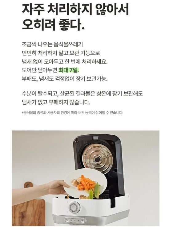 아직까지 후회 없이 잘 쓰고 있습니다. 특히, 요즘같이 습고 더운 날씨에 음식물을 반나절만 방치해도 날파리 생기고 냄새나는데, 음식물 처리기가 있어서 이런 불필요한 고통을 받을 필요가 없어서 너무 좋습니다.