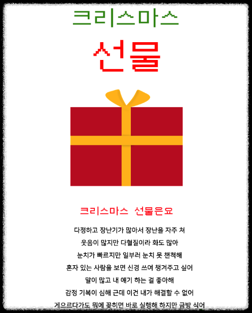 오 저는 "크리스마스 선물" 이 나왔네요. 사실 처음에 했을 떄는 "크리스마스 트리"가 나왔는데 일부로 조금 다르게 해봤더니 "크리스마스 선물"이 나왔어요.