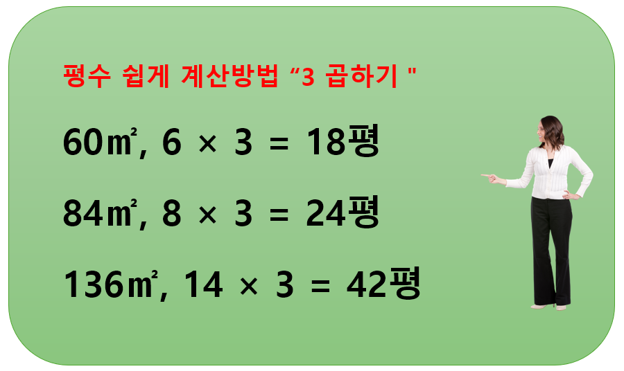 대략적인 평수를 빨리 알고 싶을 때는 제곱미터에 첫 번째 숫자에 3을 곱합니다. 정확하게 하려면 3.3을 곱하는 것이 맞지만, 암산으로 쉽지 않죠. 그래서 숫자 3만 곱하면 대략적인 평수를 알 수 있습니다.